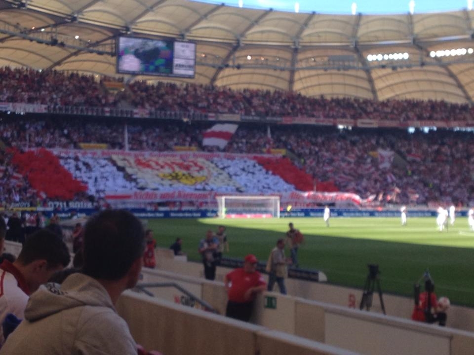 Egy hihetetlenül kedves és jófej gerlingeni baráttól kaptam 2 jegyet a VfBStuttgart utolsó otthoni meccsére. Kathrint hívtam el, ketten mentünk. A belépő a vonatjegyet is tartalmazta, úgyhogy így elég kényelmes volt. Jó korán indultunk, de még így is tömve volt a vonat a szurkolókkal. Na de nagy nehezen megérkeztünk a stadionhoz. Ott először H.-val (ő a gerlingeni barát) találkoztunk. Neki meeting-re kellett sietni, de adott nekünk 10 eurót, hogy menjünk el a közeli sport bárba/étterembe, és igyunk egy kólát. :) El is mentünk. Nagyon jó az a hely, most voltam ott harmadszor. Minden sporteseményt közvetítenek, és minden szurkoló ott van meccsek előtt és után. :) Még üldögéltünk ott egy darabig, mivel sok időnk volt, aztán bementünk a stadionba, megkerestük a helyünket, 5. sor, elég király volt. :)