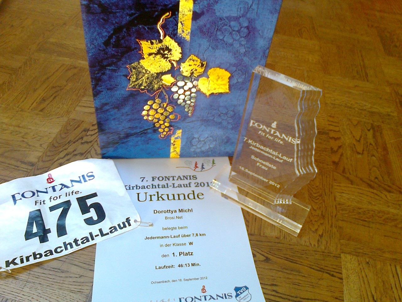 Vasárnap már izgulva ébredtem...10 körül indultunk a futóversenyre, egy másik kis faluban rendezték. Regisztráltunk, megkaptuk a rajtszámokat, meg kis csipet a cipőre (mindig féltem, hogy elhagyom...), aztán bemelegítettem. Ahogy mentem a rajthoz, magyar beszédet hallottam mögöttem, hátra fordultam és köszöntem nekik, természetesen magyarul. 2 magyar volt, közülük az egyik futott, de nagyon vicces volt. Persze aztán futás után is beszélgettünk még, elmondták ők mit csinálnak itt, én is elmondtam... De jó érzés volt nagyon. :) Aztán akkor visszaszámoltak, és elindultunk. Kb. 15 perc után már meghaltam, mivel hogy a táv elején van a hegy. Elég nagy darab és nem is azzal van a bajom, hogy fölfele kell futni, hanem mikor felérek utána továbbfutni a nehéz. Nekem legalábbis. Kb. 4,5 km-ig nagyon szenvedtem, aztán már jobban ment. A végén nagyon jó hangulata volt az egésznek, végig az utcán szurkolók, doboltak, tapsoltak meg minden...egy néni mondta hogy én vagyok az első nő, mondom magamban, az nem lehet, mert már páran elfutottak mellettem (később kiderült, hogy ők a hosszabb távot futották csak ugyanarra mentünk egy darabig). Aztán a célhoz közeledve mint mindenkinek, nekem is mondták a nevem a mikrofonba (vicces, mert otthon általában a vezetéknevemet nem tudják kimondani, itt azzal semmi gond nincs, viszont ugye a Dorottyát, Doroteának mondják). Aztán beértem... És akkor a magyarok, meg Marc is mondták, hogy megnézték az eredményeket, mert azokat már kirakták rögtön utána, és hogy első vagyok.Mondtam, biztos valamit félrenéztek. Aztán mégsem. Összességében 7,8 km-en 58-ból 19. lettem, a nők között pedig első. Eléggé csodálkoztam, mert az időm szerintem nem lett jó. Kaptam egy oklevelet, egy szép kis kupát, meg 3 üveg bort (azzal még nem tudom mit csinálok).