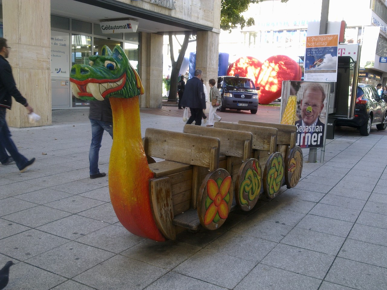 Na aztán kezdődött a városnézés. Jó, nem volt az az igazi városnézés, nem voltam múzeumban meg ilyesmi. :) De sokat sétáltam, nézelődtem a boltokban, meg nosztalgiáztam, mivel a családommal és a sulis kórussal is voltunk Stuttgartban és pont azokon a helyeken jártam ma mint velük. :) Jó volt nagyon. Az ebédemet úgy oldottam meg, hogy még itthon sütöttem husit azt vittem magammal, ott meg vettem hozzá finom friss zsömlét. Dél körül leültem a parkban és megebédeltem, elég hangulatos volt. :)